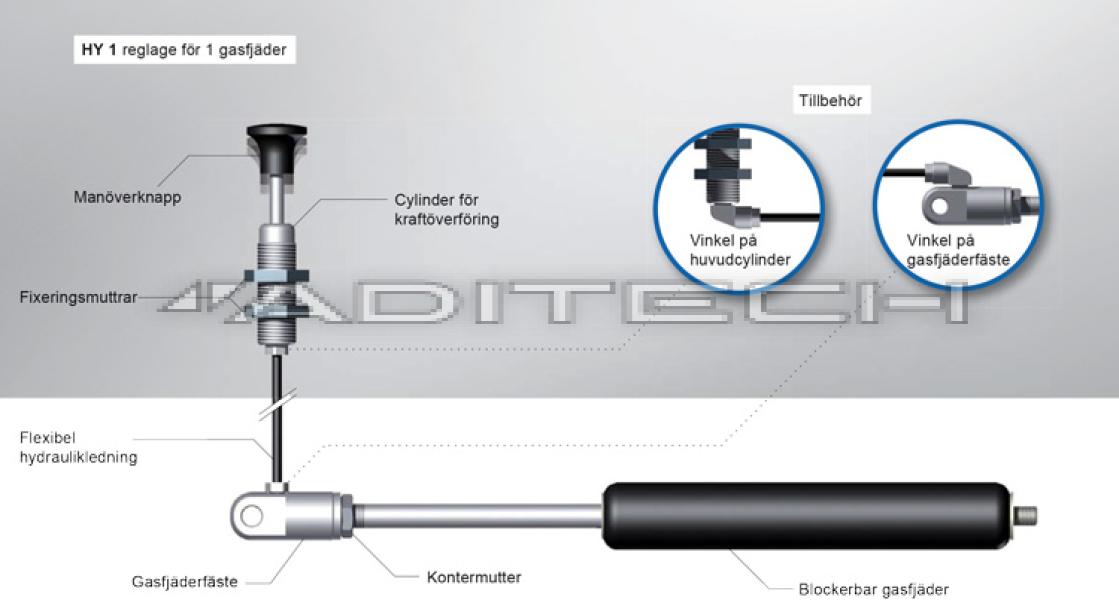 Tryckknappssystem för hydraulisk manövrering av blockerbara gasfjädrar S10-23 och S10-28. Finns i fyra olika utföranden med passande tillbehör.
